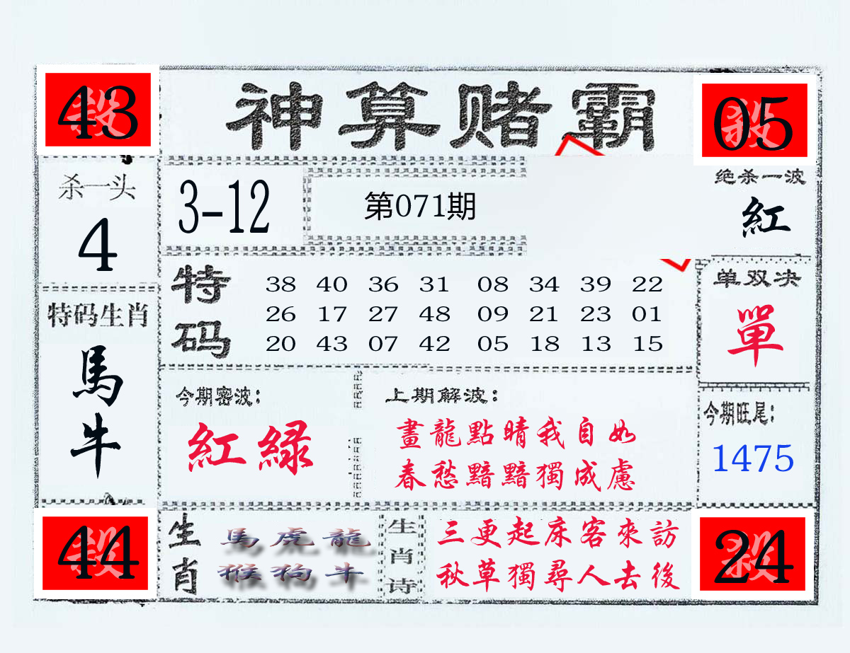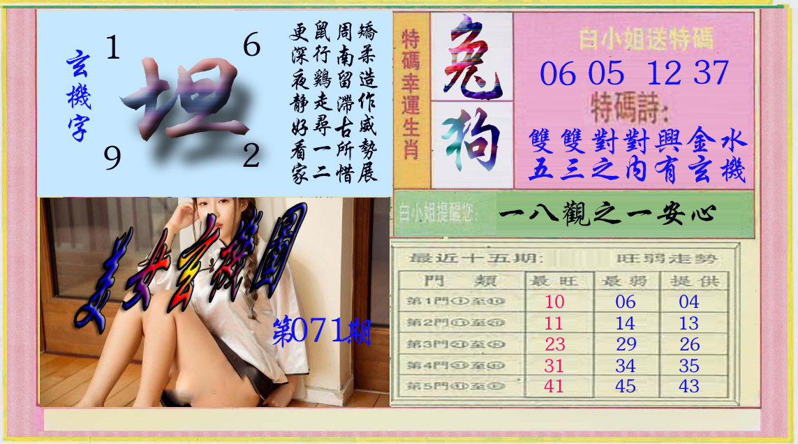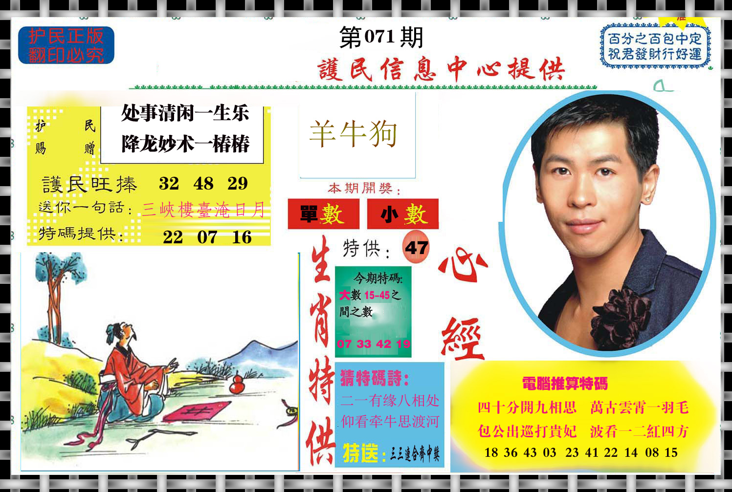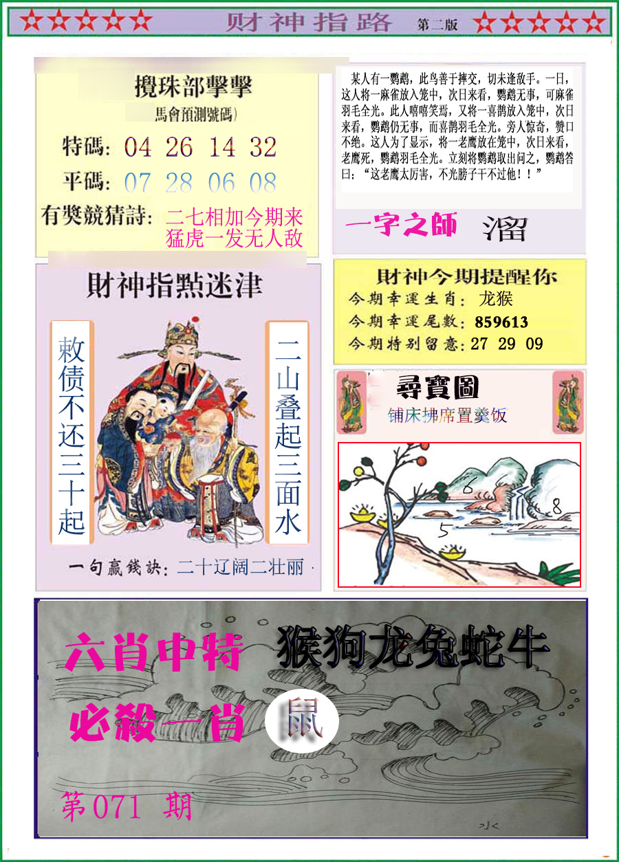 | 第071期 | 牛 虎 鼠 羊 猴 龙 兔 | 开 ???? |