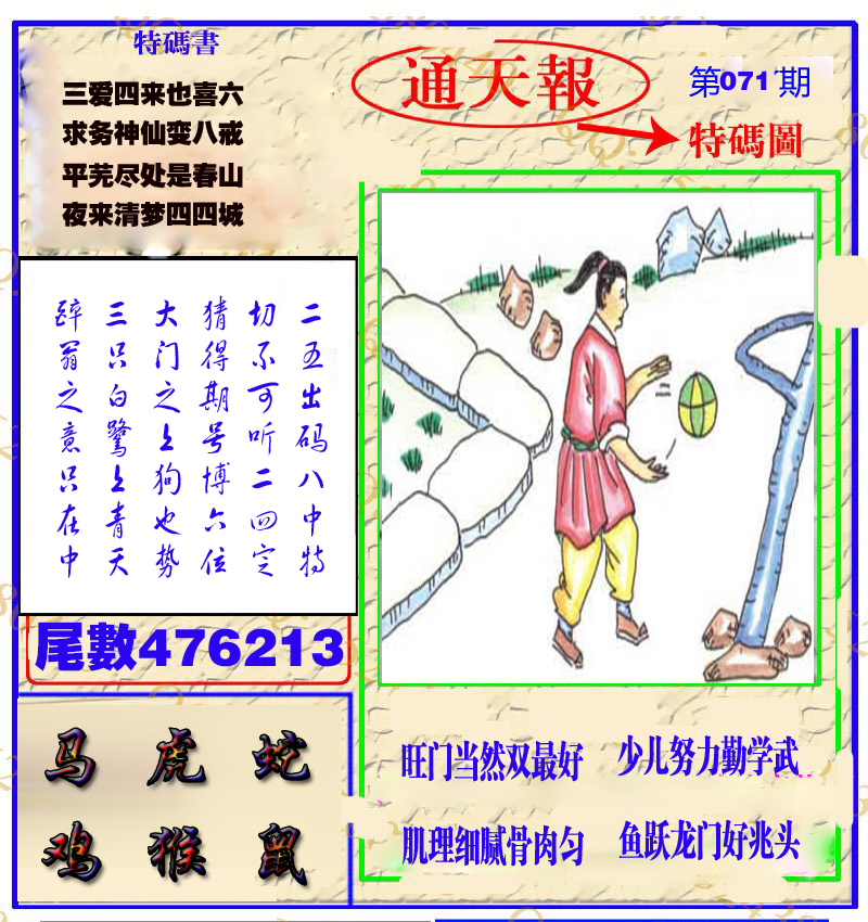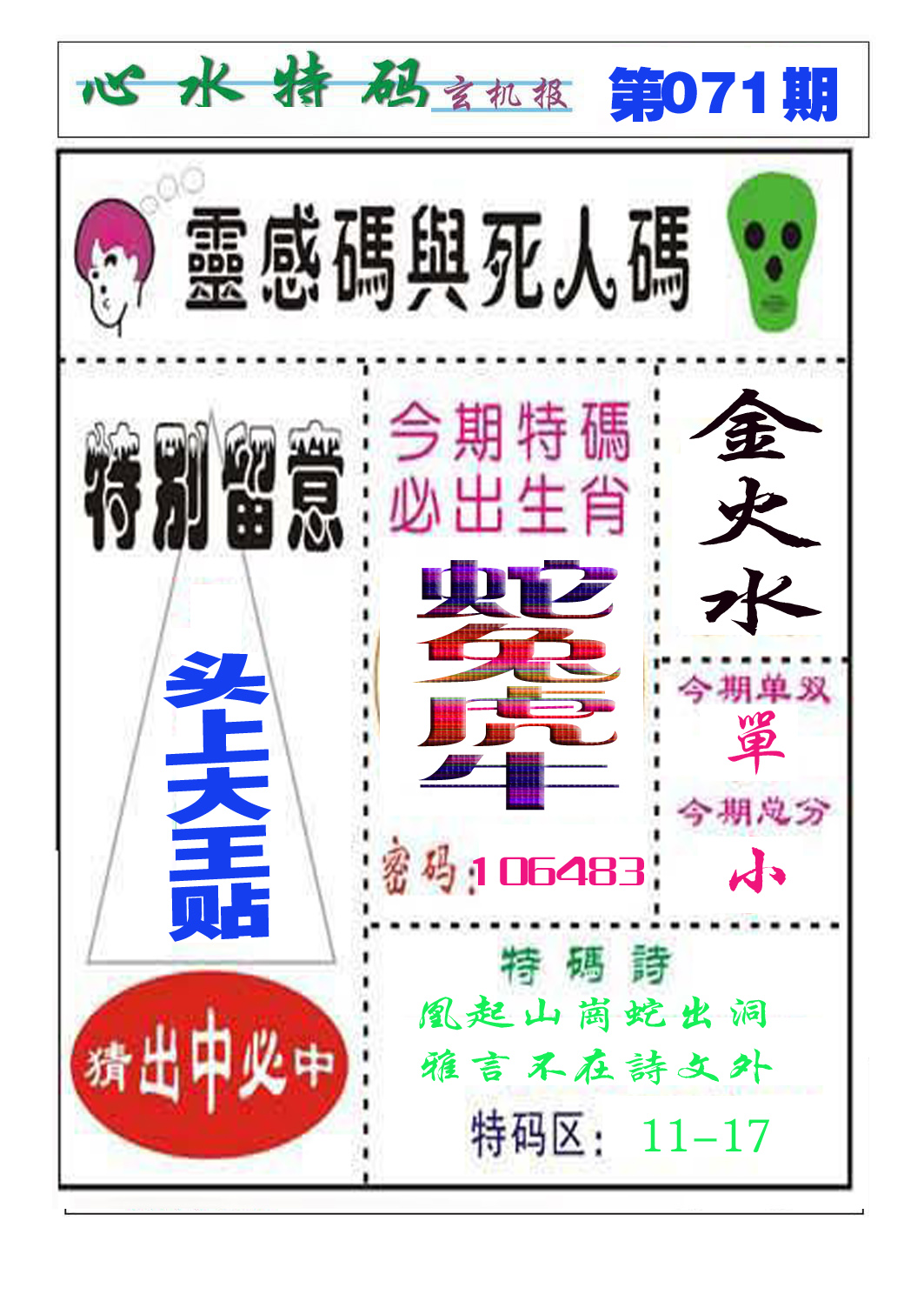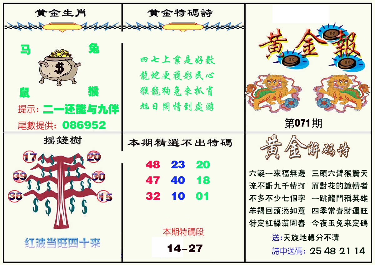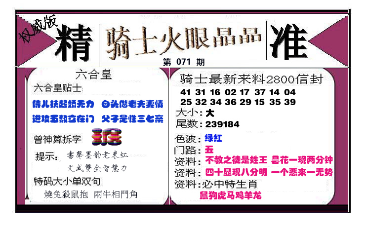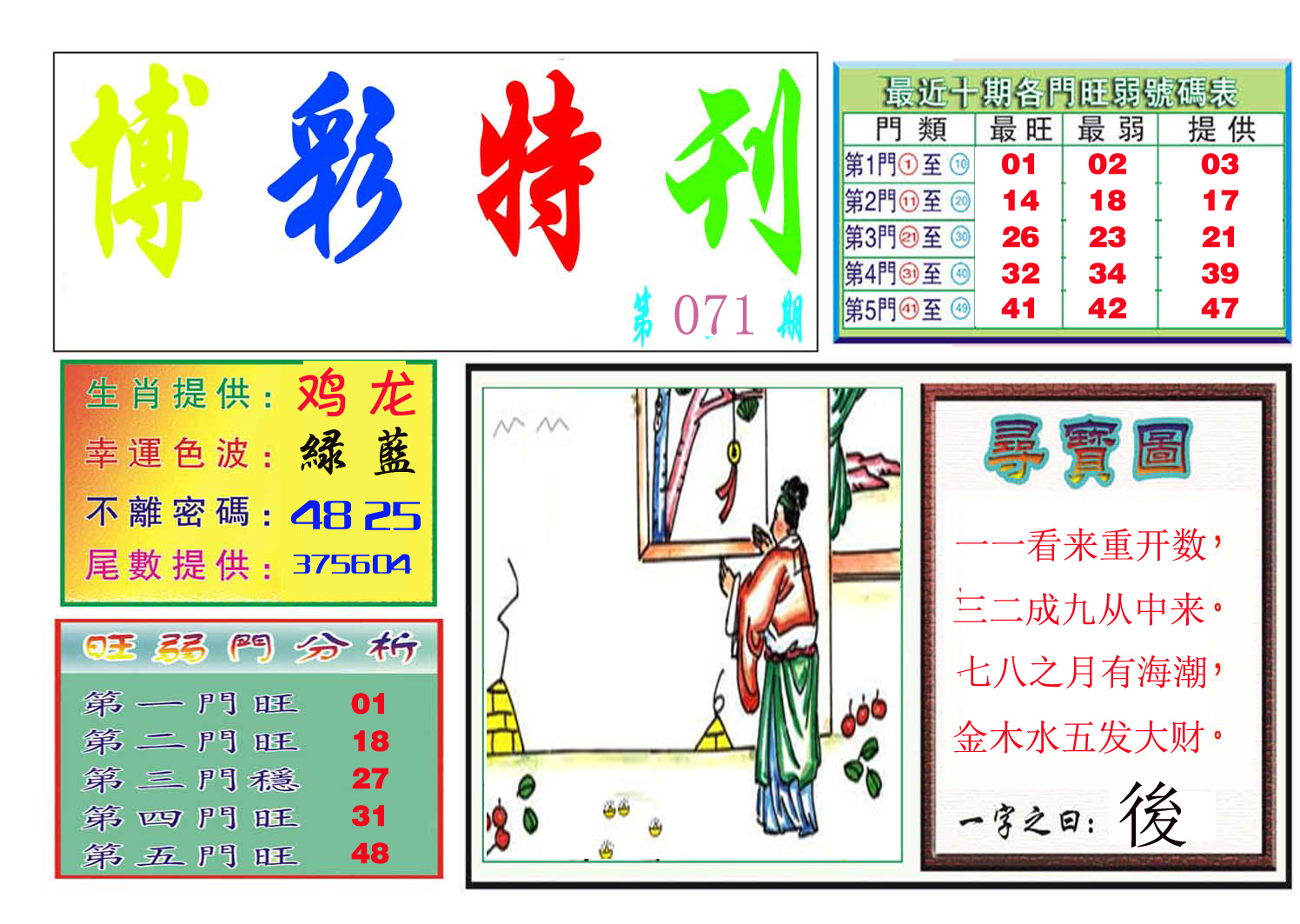 | 第071期 | 牛 虎 鼠 羊 猴 龙 兔 | 开 ???? |